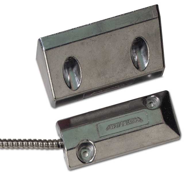 Marchio: ARITECH. Articolo: DC108. Contatto magnetico in alluminio per installazione a pavimento. GAP 75 mm. Completo di cavo armato. Omologato IMQ I Liv.