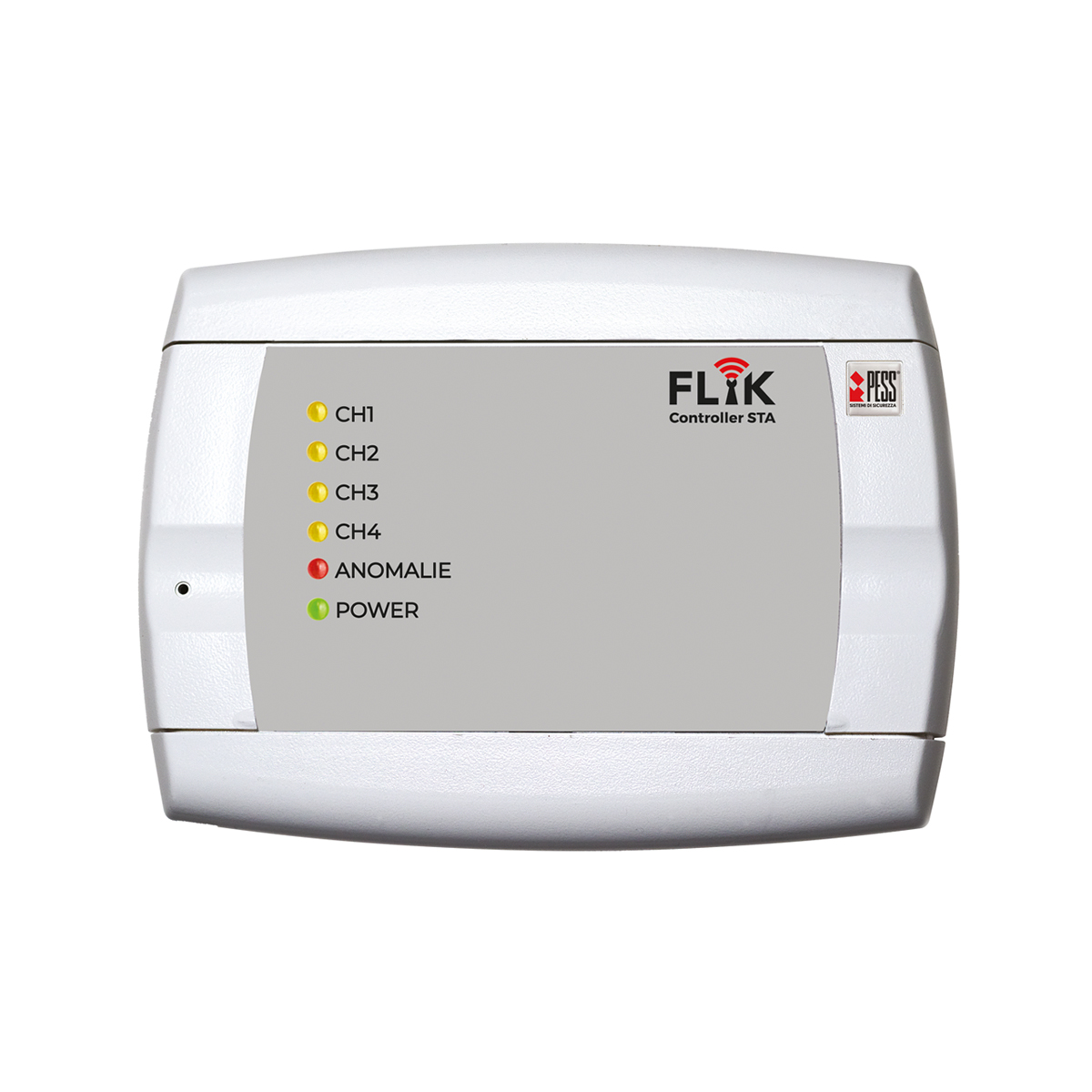 Codice: P1510000Marchio: PESS. Articolo: Flyk Controller Stand Alone. Interfaccia radio di comunicazione stand alone, bidirezionale, per sensori e radiocomandi della serie FLYK. Collegabile a qualunque centrale di tipo tradizionale. CARATTERISTICHE FUNZIONALI:• Gestisce fino a 32 sensori suddivisi su 4 uscite di allarme C-NC indipendenti (max 8 sensori per ciascuna uscita)• Gestisce fino a 8 radiocomandi mod. RC KEY• Funzione di Supervisione (disabilitabile)• Uscita C-NC di allarme Tamper e/o Antimask e/o Allarme supervisione• Uscita C-NC di indicazione Pile scariche sui sensori• Uscita programmabile Bistabile/Impulsiva abbinata al tasto 1 dei radiocomandi• Uscita programmabile Bistabile/Impulsiva abbinata al tasto 2 dei radiocomandi• Ingresso di stato (ON/Off) della centrale• 4 LED di memoria allarme (funzionano solo se la centrale dispone di uscita per l’indicazione dello stato)• 1 LED per l’indicazione di presenza anomalie (Tamper, Mask sensori, Pile scariche e/o supervisione)• Alimentazione 12Vdc• Programmabile tramite dip switch e tastini a bordo scheda