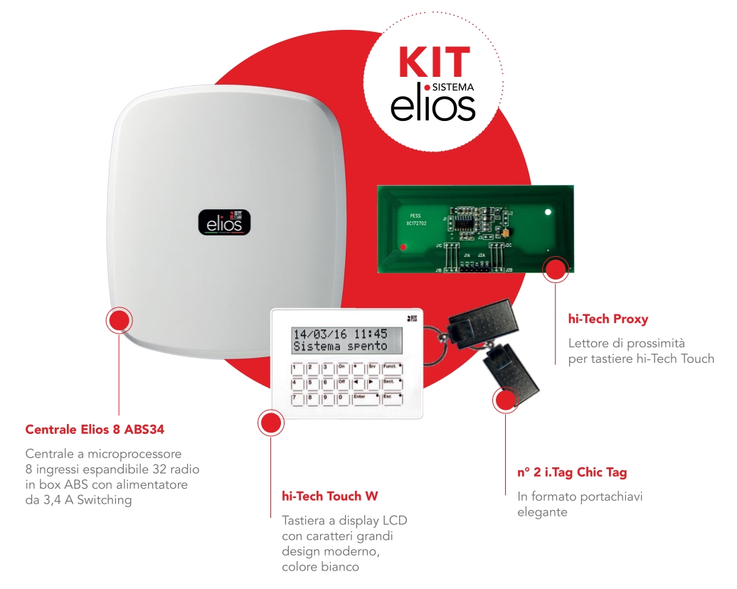 Marchio: PESS. Articolo: KIT ELIOS 8 ABS34. Kit completo di Centrale Elios 8 ABS34, tastiera hi-Tech Touch W, modulo lettore di prossimità hi-tech Proxy e 2 i.Tag Chic (ordine minimo per l’installatore n° 5 Kit )